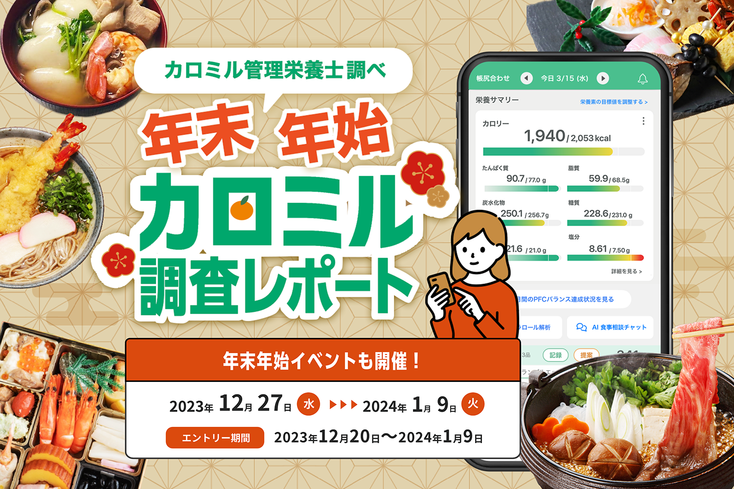 調査結果を受け、年末年始に食事記録を継続して来る新しい年も健康に過ごしていただけるよう、当社では「カロミル」を使った年末年始期間中の記録イベントを開催いたします。