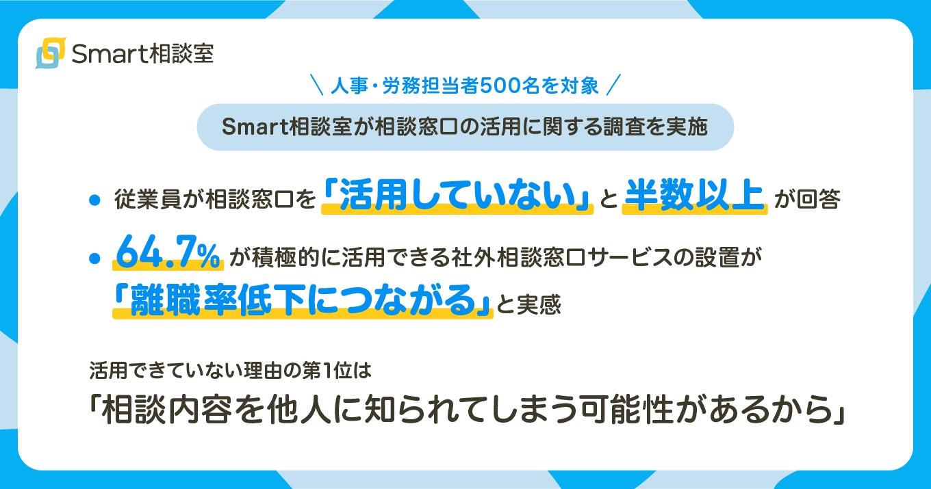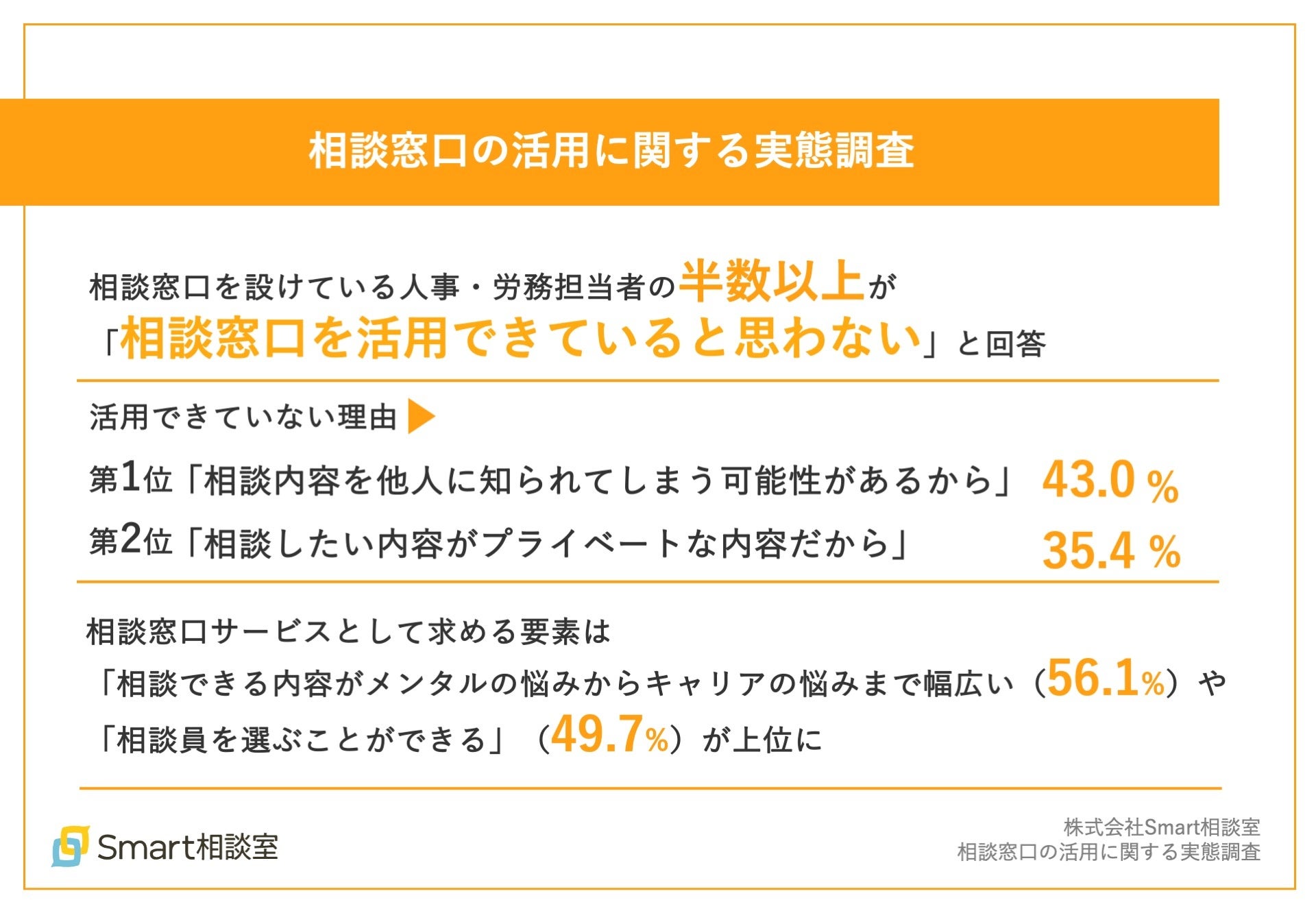 株式会社Smart相談室(本社:東京都港区、代表取締役・CEO:藤田 康男)は、相談窓口を設けている従業員数50人以上1000人未満の企業に勤めている人事・労務担当者535名を対象に、相談窓口の活用に関する実態調査を実施しました。
