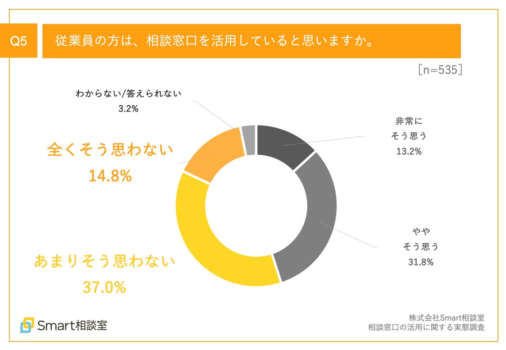 実際の活用状況について、「Q5.従業員の方は、相談窓口を活用していると思いますか。」(n=535)と質問したところ、「あまりそう思わない」が37.0%、「全くそう思わない」が14.8%という回答となりました。