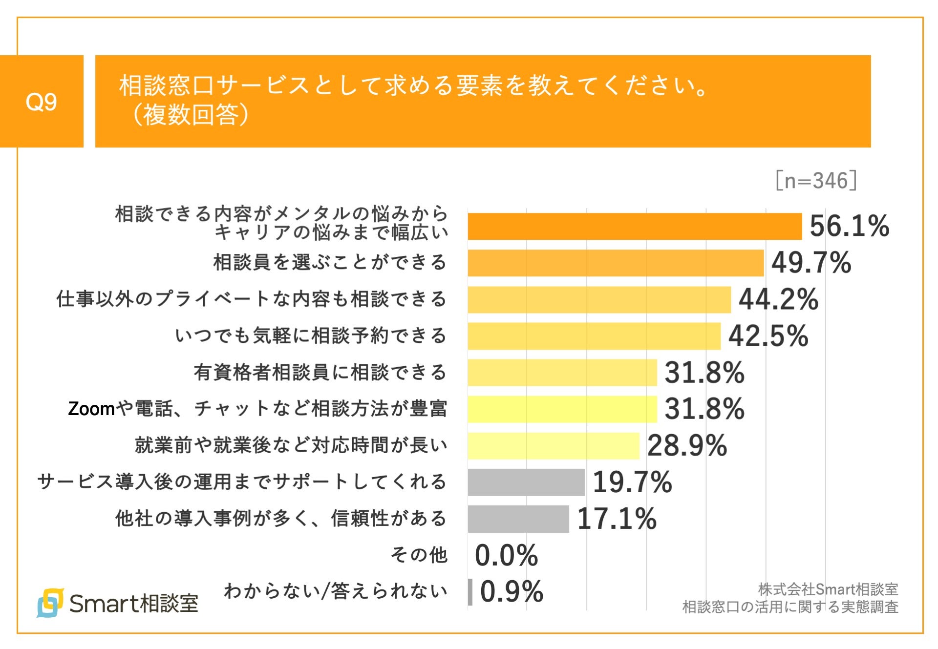 Q8で「非常にそう思う」「ややそう思う」と回答した方に、「Q9.相談窓口サービスとして求める要素を教えてください。(複数回答)」(n=346)と質問したところ、「相談できる内容がメンタルの悩みからキャリアの悩みまで幅広い」が56.1%、「相談員を選ぶことができる」が49.7%、「仕事以外のプライベートな内容も相談できる」が44.2%という回答となりました。