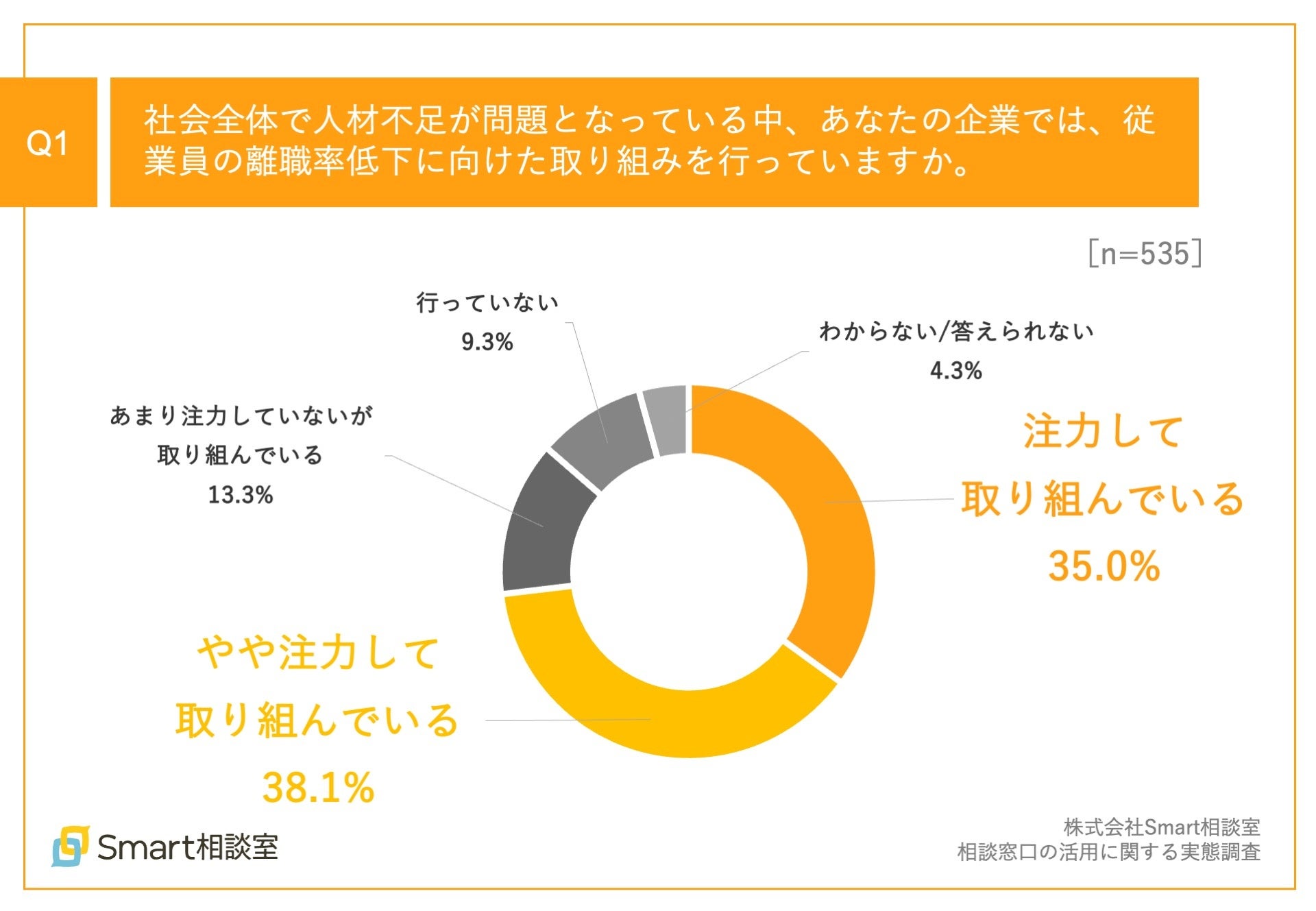 「Q1.社会全体で人材不足が問題となっている中、あなたの企業では、従業員の離職率低下に向けた取り組みを行っていますか。」(n=535)と質問したところ、「注力して取り組んでいる」が35.0%、「やや注力して取り組んでいる」が38.1%という回答となりました。
