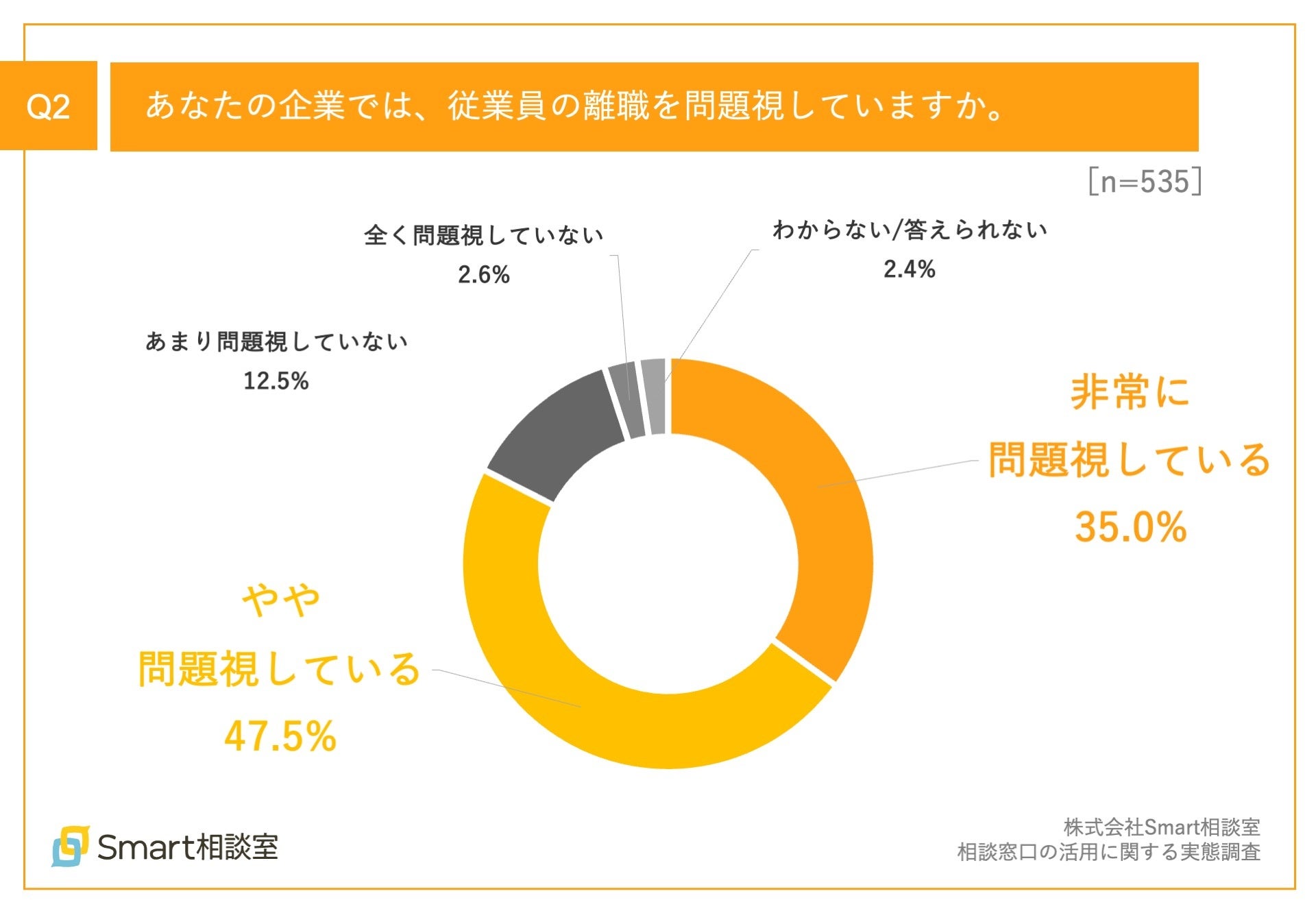 また、「Q2.あなたの企業では、従業員の離職を問題視していますか。」(n=535)という質問には、「非常に問題視している」が35.0%、「やや問題視している」が47.5%という回答となりました。