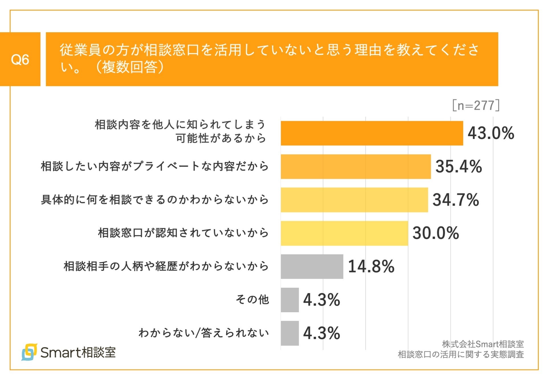 また、Q5で「あまりそう思わない」「全くそう思わない」と回答した方に、「Q6.従業員の方が相談窓口を活用していないと思う理由を教えてください。(複数回答)」(n=277)と質問したところ、「相談内容を他人に知られてしまう可能性があるから」が43.0%、「相談したい内容がプライベートな内容だから」が35.4%、「具体的に何を相談できるのかわからないから」が34.7%という回答となりました。