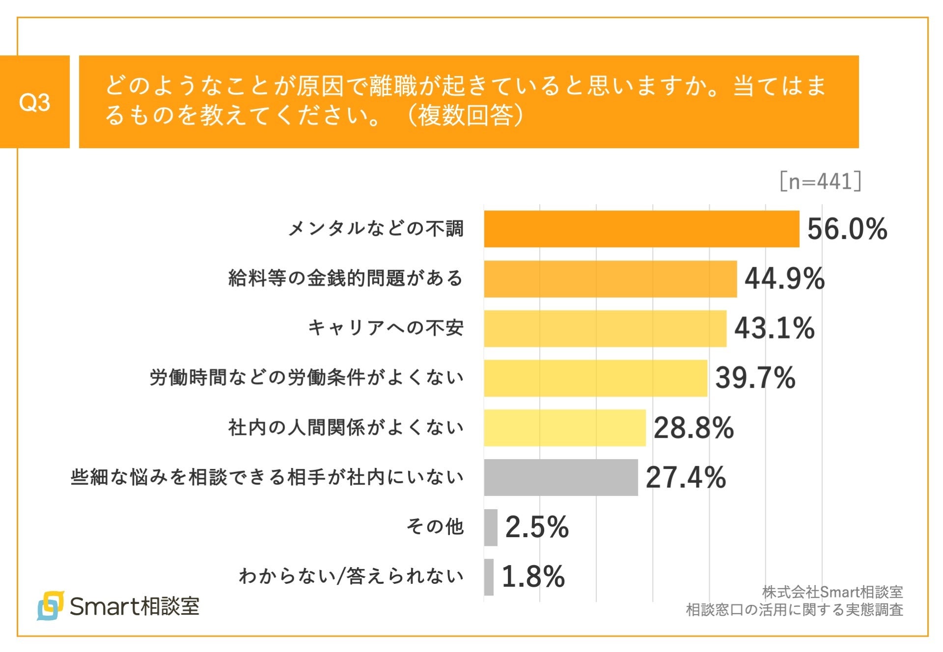 Q2で「非常に問題視している」「やや問題視している」と回答した方に、「Q3.どのようなことが原因で離職が起きていると思いますか。当てはまるものを教えてください。(複数回答)」(n=441)と質問したところ、「メンタルなどの不調」が56.0%、「給料等の金銭的問題がある」が44.9%、「キャリアへの不安」が43.1%という回答となりました。