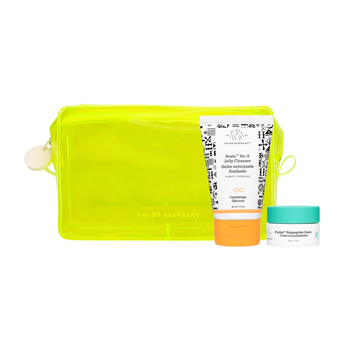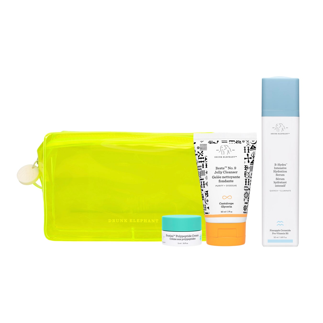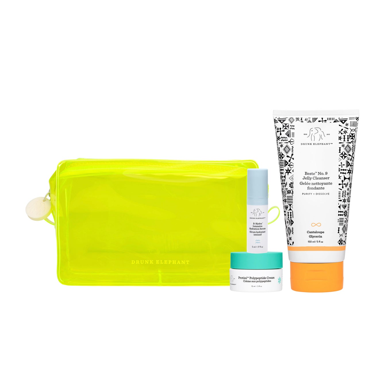 初めてドランク エレファント製品をご購入下さる方に。サウナや銭湯、スポーツやジムで使用するミニサイズのスキンケアをお探しの方に。オリジナルビニールポーチ付きで、水回りでの使用にも安心のキットです。