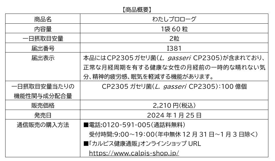 ・「CP2305ガセリ菌」は、「カルピス」に由来する長年の乳酸菌研究により選び抜かれたアサヒグループ独自の乳酸菌です。「正常な月経周期を有する健康な女性の月経前の一時的な晴れない気分、精神的疲労感、眠気を軽減する機能があります」と研究報告されています。