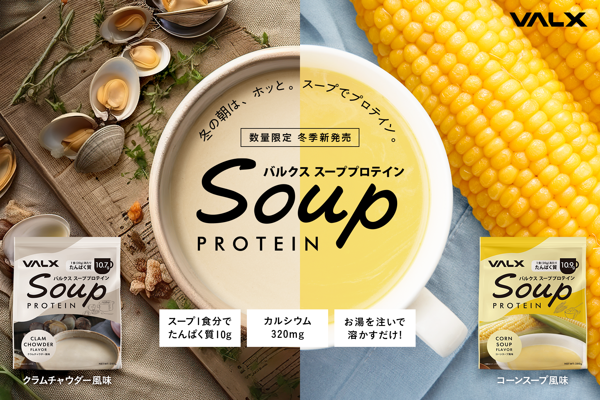 「前例のない熱狂を、しかける。」をミッションに掲げるレバレッジは、寒い冬は温かいものからタンパク質を摂りたい、冷たいプロテインで身体を冷やしたくない、美味しいスープとしてプロテインを飲みたい、そんな皆様の声に応えるべく、2年もの歳月をかけて「VALX スーププロテイン クラムチャウダー風味/コーンスープ風味」を開発いたしました。