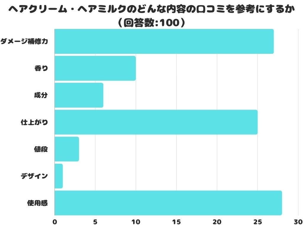 ヘアクリーム・ヘアミルクのどんな内容の口コミを参考にするかをアンケートにて調査したところ、1位は「使用感」でした。