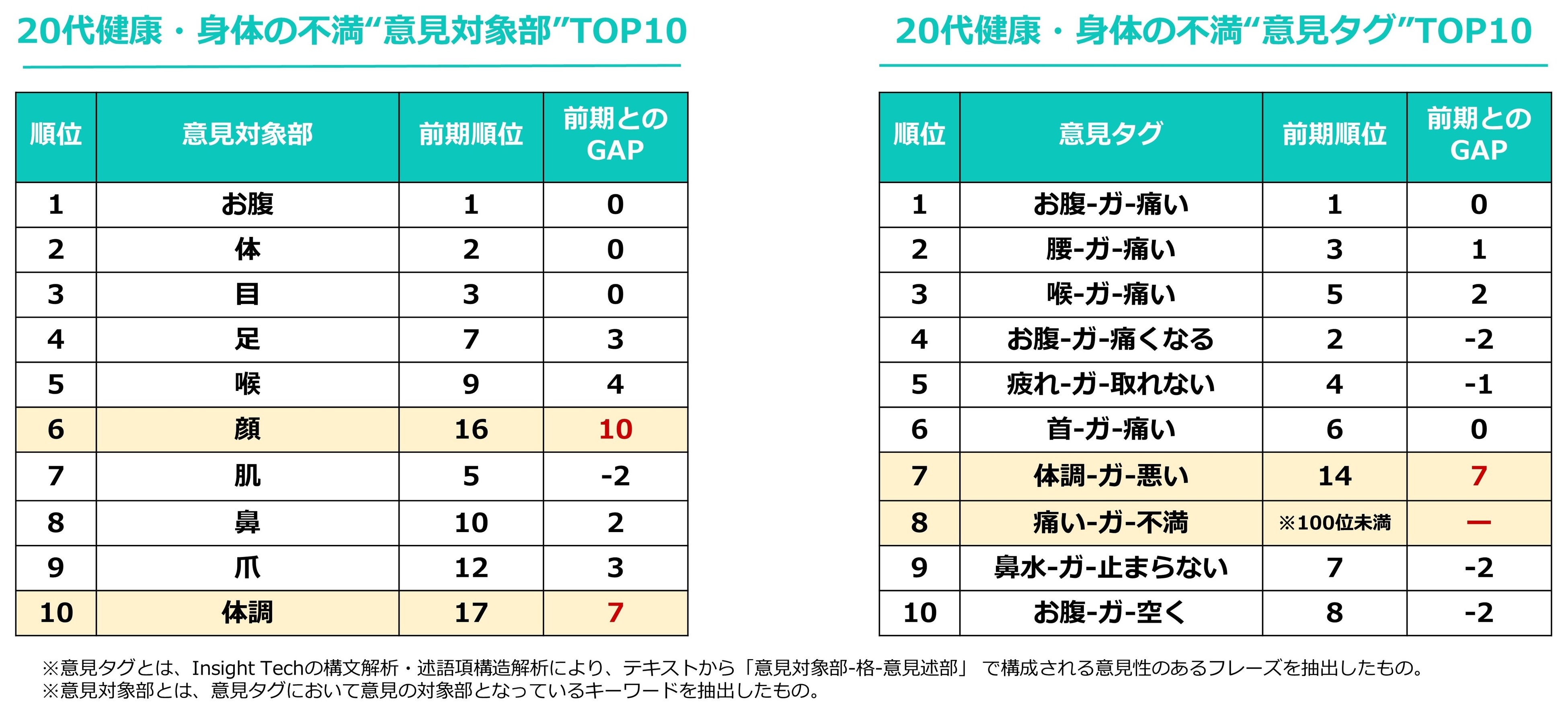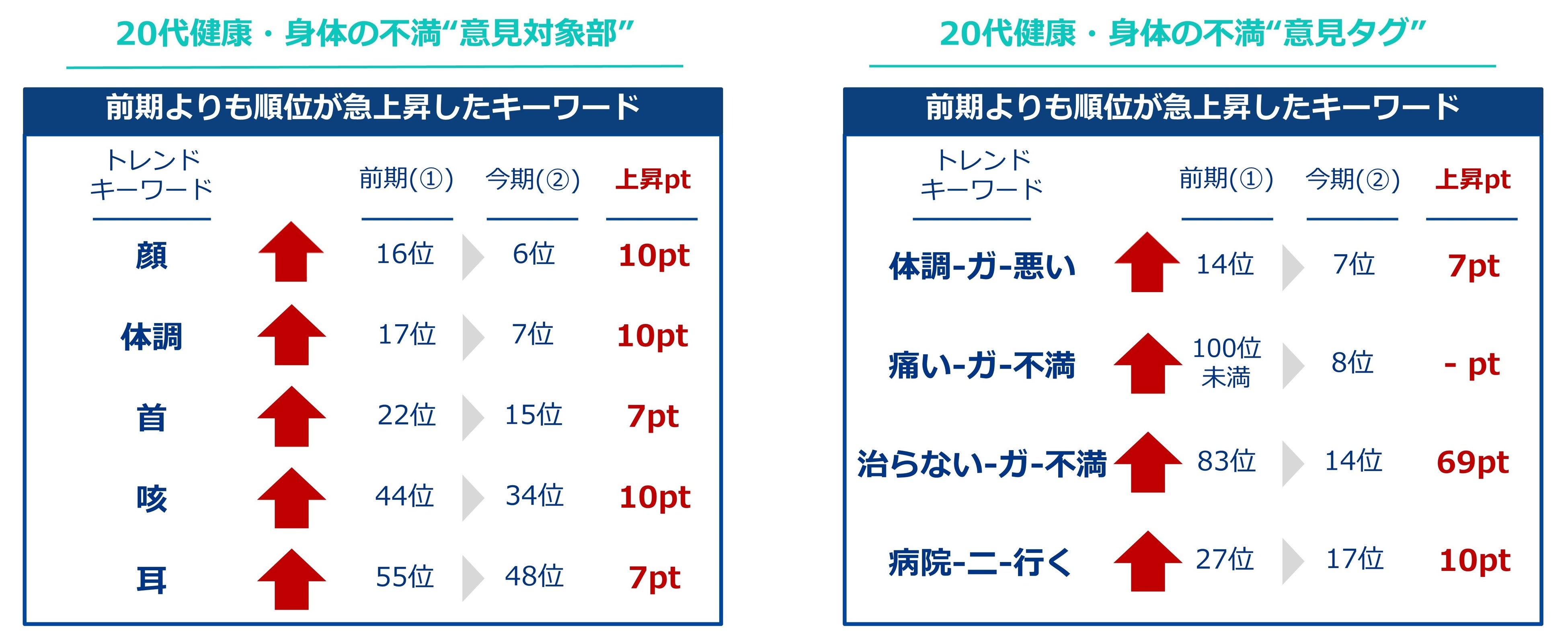 出現キーワードのランキングをみると、意見対象部の上位は特定の部位が大半を占める中、新たに「顔」や、部位以外にも「体調」がランクインした。意見タグの上位を見ると、体調に関する「体調-ガ-悪い」や、横断的な意見である「痛い-ガ-不満」がランクインした。