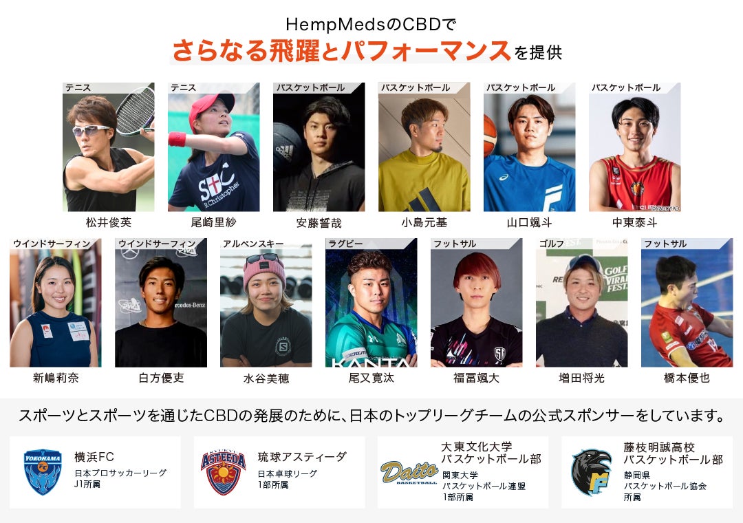 HempMeds(ヘンプメッズ)は、スポーツとスポーツを通じたCBDの発展のために、日本のトップリーグのチーム、アスリートをサポートさせて頂いております。