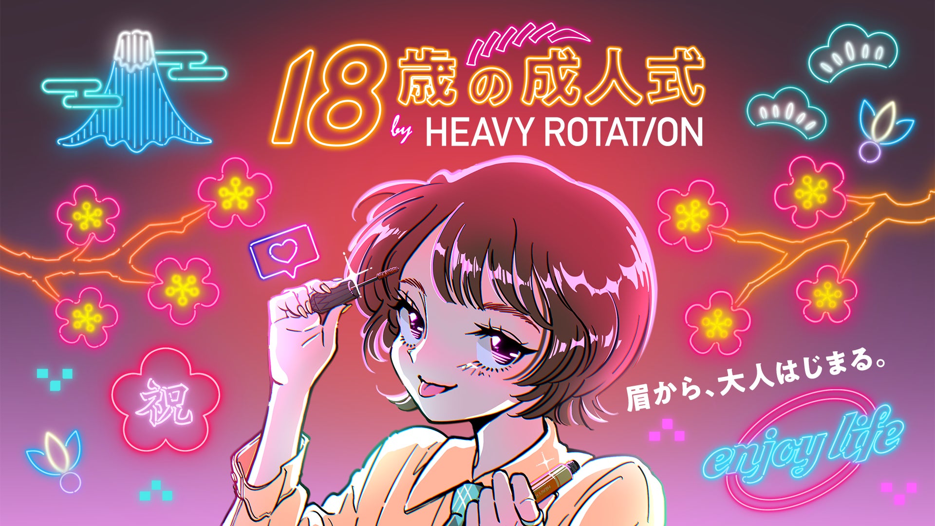 成人年齢が18歳となり、今年は2回目の成人式シーズンとなります。昨年は18歳と成人の年齢が変わったものの、成人式を実施した自治体は少なく、18歳となった皆さんも特に何も行わない方が多く見受けられました。多くの学生の皆さんにご愛用いただいている「ヘビーローテーション」は、18歳で大人への一歩がはじまる大事なタイミングに、眉からはじまる特別な体験を届けたいと考え、SHIBUYA109 渋谷店8階の「Creator Collaboration Space」にて、18歳と昨年成人式をしそびれた19歳の皆さんに向けたイベントを企画しました。メインビジュアルは、イラストレーターの佐藤なつみさんに「18歳の成人式」をテーマに書き下ろしていただきました。