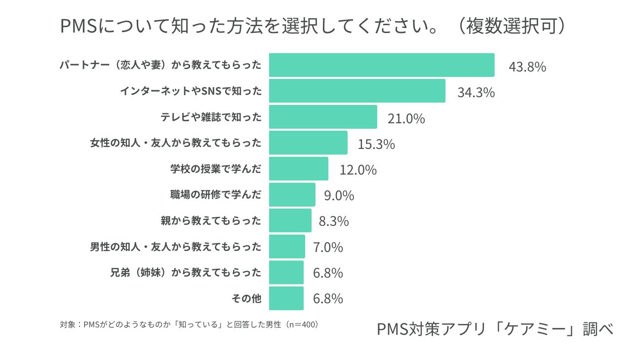 PMSを「知っている」と回答した男性はどのようにしてPMSを知ったのか。一番多かった回答は、「パートナー(恋人や妻)から教えてもらった(43.8%)」、2番目に多かったのは「インターネットやSNSで知った(34.3%)」であり、身近にいるパートナーや気軽にアクセスできるインターネットやSNSから情報を得ていることが分かりました。