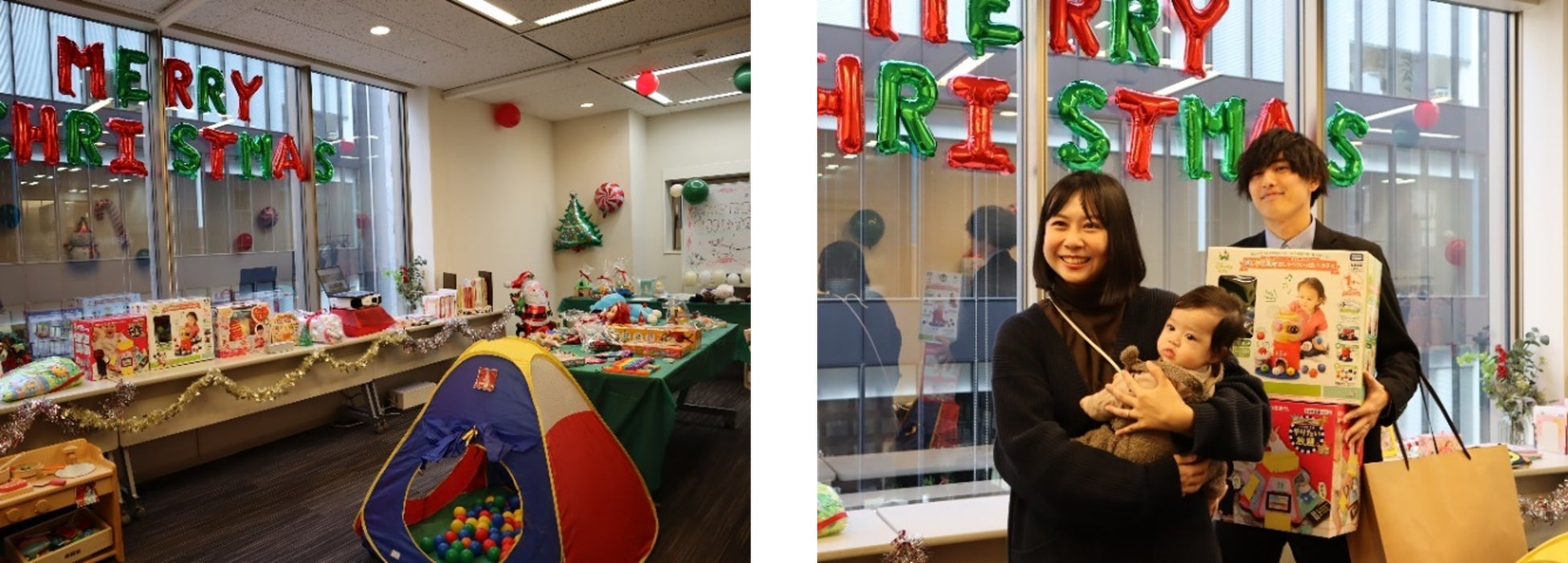 そこで今回は、子どもから子どもへクリスマスプレゼントとしておもちゃを譲渡する「継承クリスマス」イベントを開催しました。SDGsの廃棄物削減の観点から、『捨てるにはもったいないが、もう家にあっても使わなくなってしまったおもちゃ』をリユースし、お子さんの大切なおもちゃとの出会い・別れを経験するイベントとして実施。当日は、参加したお子さんはもちろん、ママ・パパ社員も大喜び!『継承クリスマス』イベントを楽しんでいた様子でした。