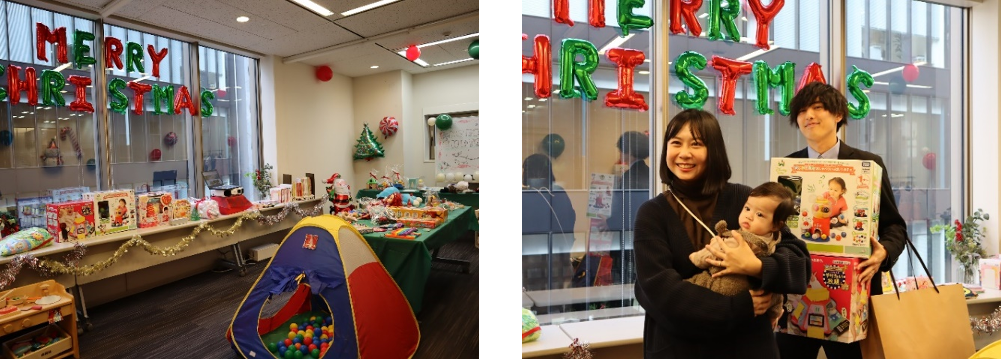 そこで今回は、子どもから子どもへクリスマスプレゼントとしておもちゃを譲渡する「継承クリスマス」イベントを開催しました。SDGsの廃棄物削減の観点から、『捨てるにはもったいないが、もう家にあっても使わなくなってしまったおもちゃ』をリユースし、お子さんの大切なおもちゃとの出会い・別れを経験するイベントとして実施。当日は、参加したお子さんはもちろん、ママ・パパ社員も大喜び!『継承クリスマス』イベントを楽しんでいた様子でした。