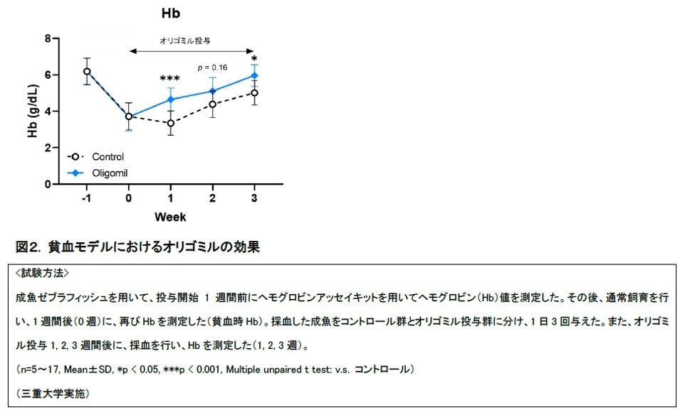 また、全身の血液量の増加は、個体の成長ならびに骨化に必要なことが知られています。血液量増加能を評価すべく、貧血モデルにてヘモグロビン量の変動を観察しました。その結果、貧血状態からのヘモグロビン量の回復が、オリゴミル投与無し群と比べてオリゴミル投与群で早いことが確認されました。
