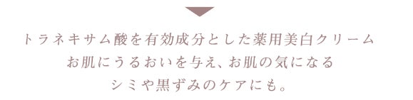 有効成分である「トラネキサム酸」を配合することによりメラニンの過剰な産生を抑え、黒ずみ(シミ・そばかす)を防ぎます。同時に、セイヨウナシ果汁発酵液が肌のターンオーバーを促進し、肌のトーンを均一に整えて透明感のある肌へと導いていきます。