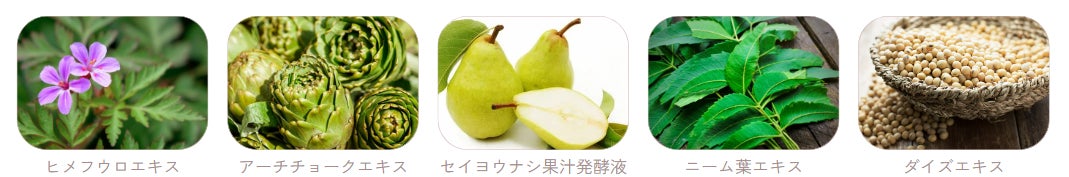ニーム葉エキス、ダイズエキス、アーチチョークエキス、ヒメフウロエキス、セイヨウナシ果汁発酵液、海藻エキス、スギナ・ホップ・マツ・レモン・ローズマリーエキス、オクラエキス、ポリグルタミン酸塩
