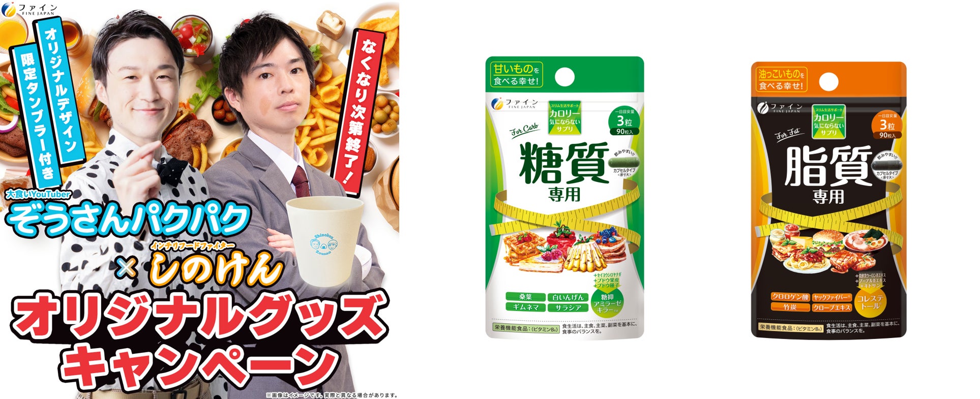 「カロリー気にならないサプリ」シリーズは、甘いもの、脂っこいものを気にせず食べたい方、ストレスフリーで食事はしっかりと摂る、健康的な生活を送りたいというすべての方をサポートするサプリメントです。今日の「食べたい」を叶え、楽しくスマートな食生活をサポートする本シリーズを届けるべく、デカ盛りフードやKg単位の料理をぺろりと美味しそうに食べてしまう豪快な食べっぷりが人気の大食いYouTuberのぞうさんパクパクさん、しのけんさんとのコラボレーションキャンペーンが実現しました。