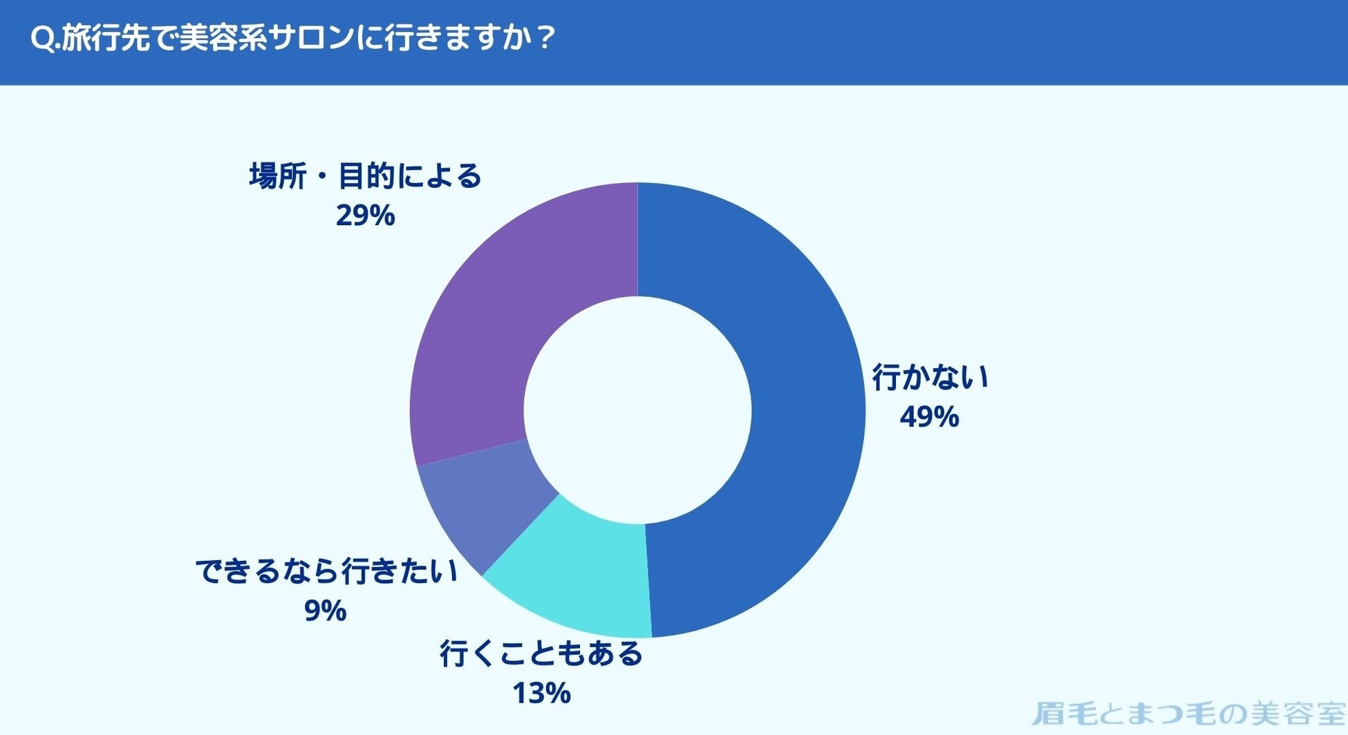 旅行先で美容サロンに行くことがあるかお聞きしたところ「行かない(49%)」、「行くこともある(13%)」、「できるなら行きたい(9%)」、「場所・目的による(29%)」という結果になりました。