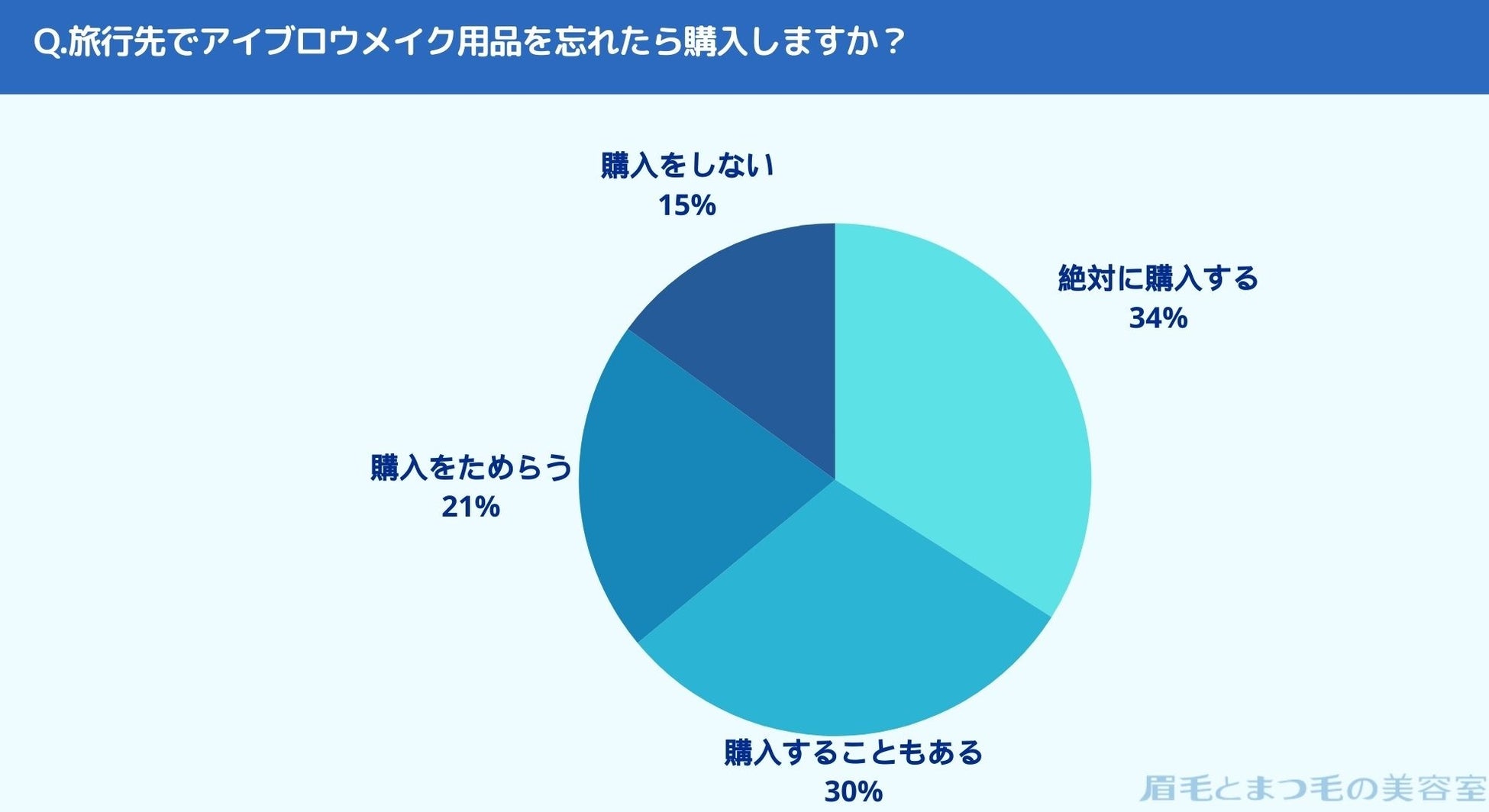 旅行先でアイブロウメイク用品を忘れたら購入するかお聞きしたところ「絶対に購入する(34%)」、「購入することもある(30%)」、「購入をためらう(21%)」、「購入をしない(15%)」という結果になりました。