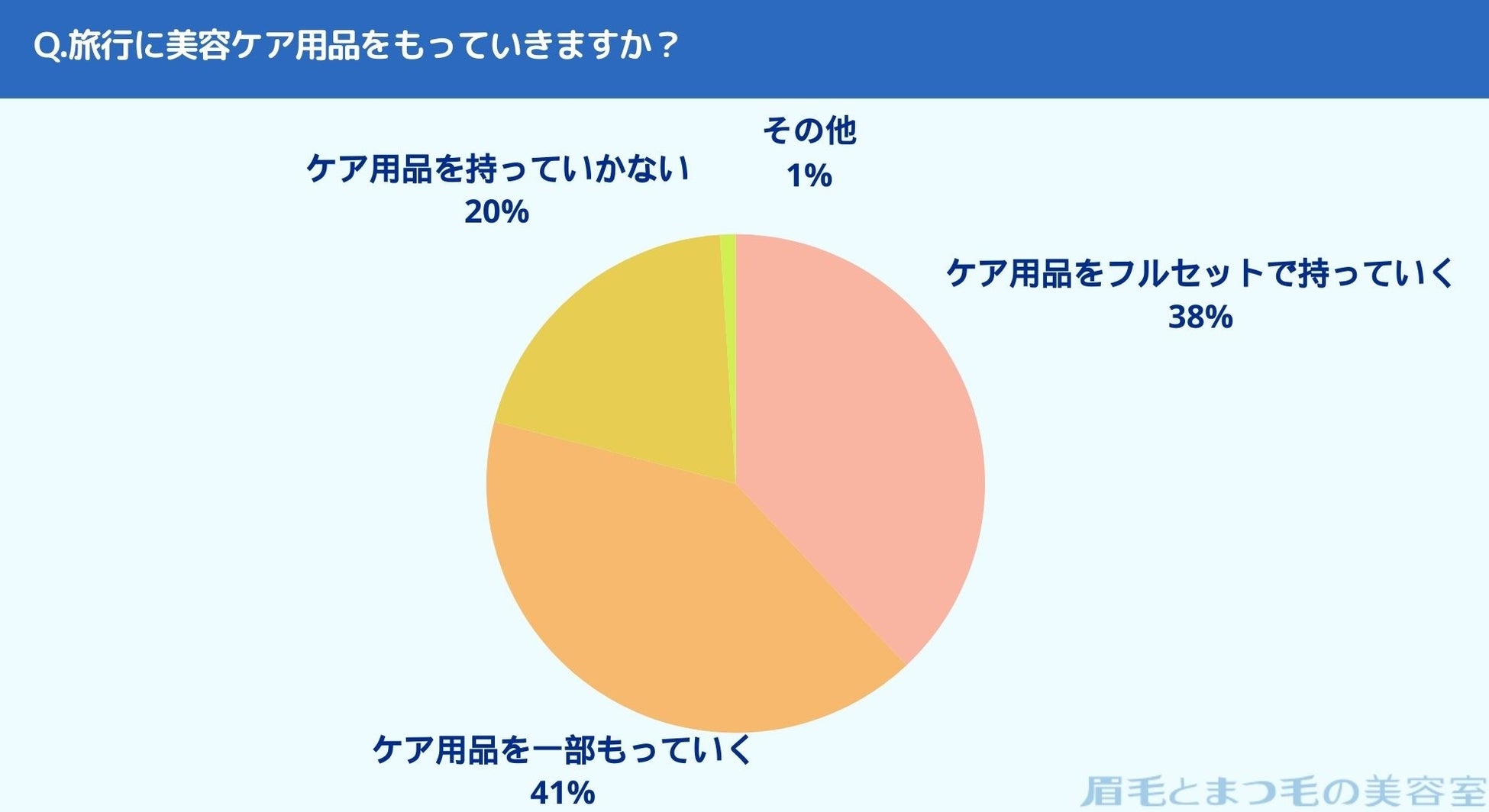 旅行先にケア用品をもっていくかお聞きしたところ「ケア用品をフルセットで持っていく(38%)」、「ケア用品を一部持っていく(41%)」、「ケア用品を持っていかない(20%)」、「その他(1%)」という結果になりました。