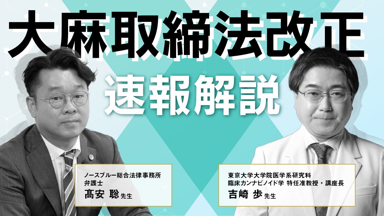 今回、医療・美容業界が注目する大麻取締法の改正について、東京大学に設立された、臨床カンナビノイド学講座の吉崎講座長と、国内では数少ないカンナビノイドに関わる裁判を数件担当し、大麻取締法及び麻向法にも精通する高安弁護士による対談が実現。Q&A形式で法改正の全容をいち早く、一般にもわかりやすく解説いたします。カンナビノイドに関心の高い市場関係者やアカデミアの方、必聴です。