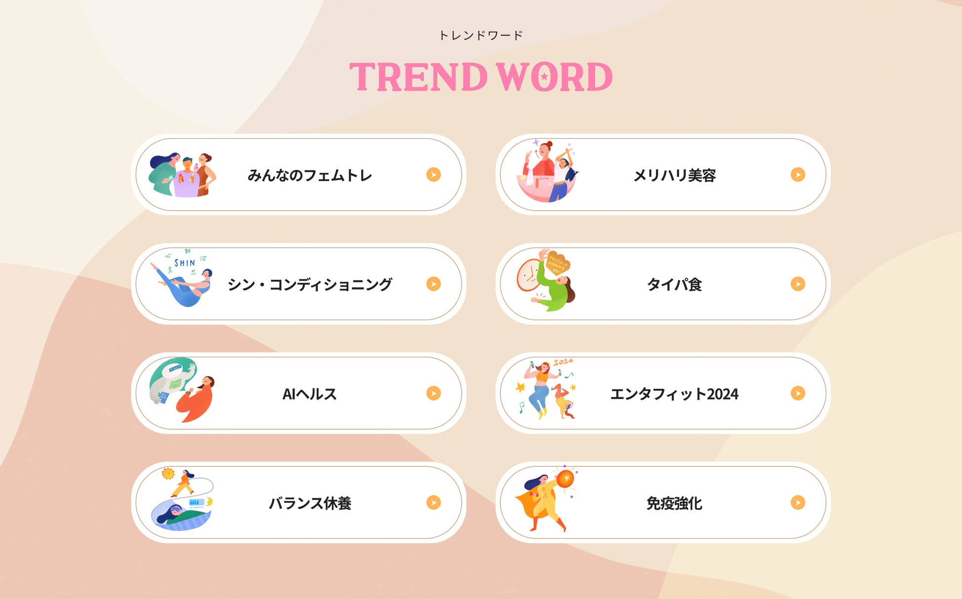 そのうえで、アフターコロナ、物価上昇、AI技術の進化などの世相も反映しながら、今回8つのトレンドワード「みんなのフェムトレ」「メリハリ美容」「シン・コンディショニング」「タイパ食」「AIヘルス」「エンタフィット2024」「バランス休養」「免疫強化」を決定しました。