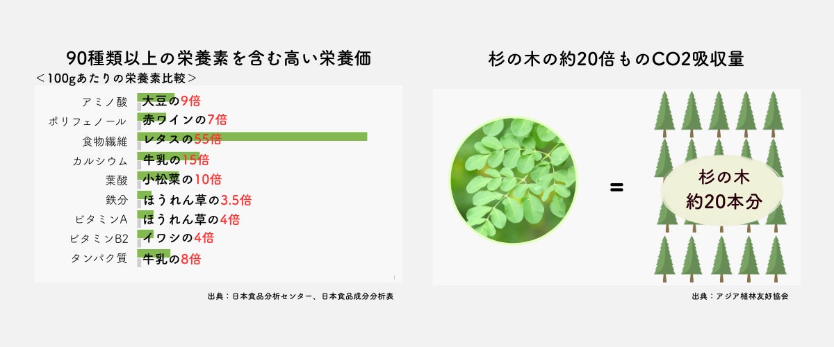 モリンガはインド原産の薬草の一種で、アミノ酸、ポリフェノール、食物繊維、ビタミンなど90種類以上の栄養素が含まれる「スーパーフード」です。その栄養価の高さから国際機関が栄養不足を解消する食物として推奨しています。また、CO2吸収量がスギの木の約20倍と言われるほど多く、地球環境に良い植物としても注目されています。