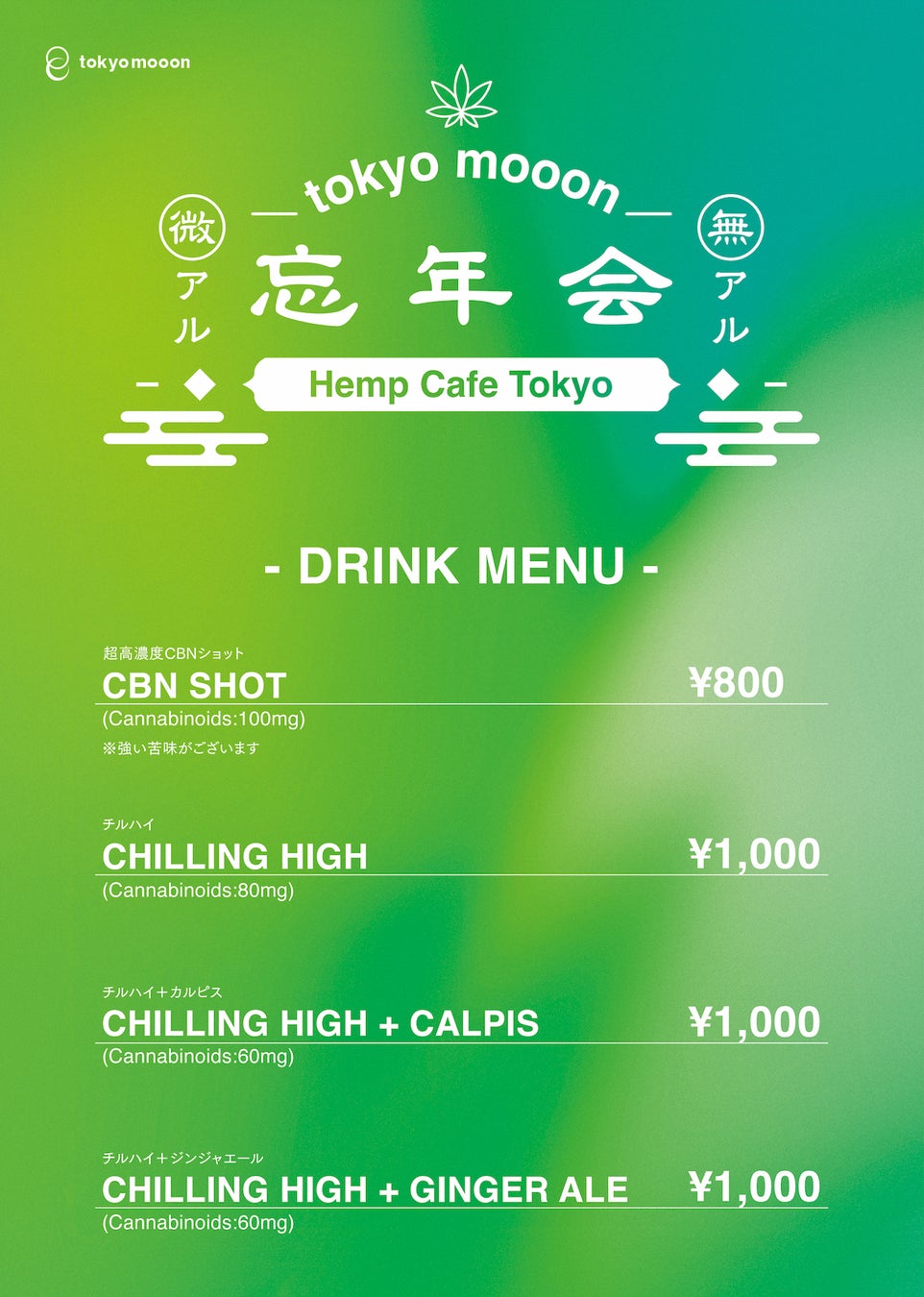 tokyo mooonは「CBD&CBNでチルする健康的な忘年会」をコンセプトにした忘年会をウェルネス・サスティナブルなライフスタイルを提案する恵比寿のレストランカフェ「Hemp Cafe Tokyo」と共催致します。