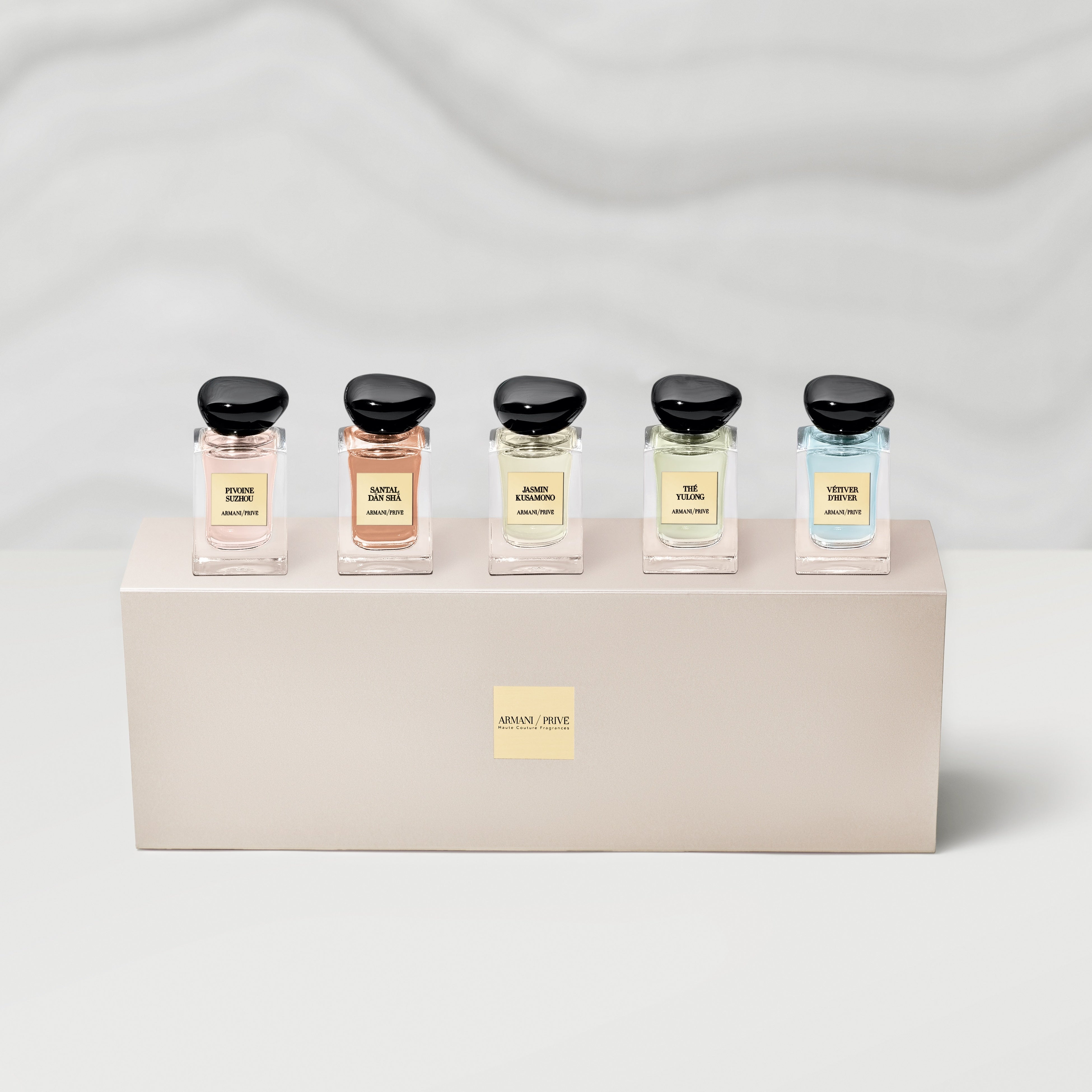 <アルマーニ プリヴェ セット>は、5種の香りが気分に合わせて使い分けられ、これからのトラベルシーズンやギフトにもおすすめのフレグランスセットです。2023年4月に発売したサンダルウッドの香り ”サンタル ダン シャ” を追加したセットで新たに登場します。