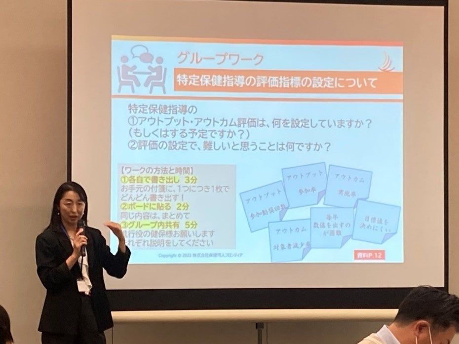 前半のグループワークでは、「データヘルス計画での評価指標の設定」や「特定保健指導の参加率向上施策」について、意見交換を行いました。同じ課題を持つ参加者が多く、具体的な事例や課題、対応策など、活発な情報交換がされていました。評価指標を出すためのポイントとして、経年的に出せる数字を設定することや、特定保健指導の参加率向上の施策として、事業主との連携の有効性など、具体的な事例を含めご紹介いたしました。