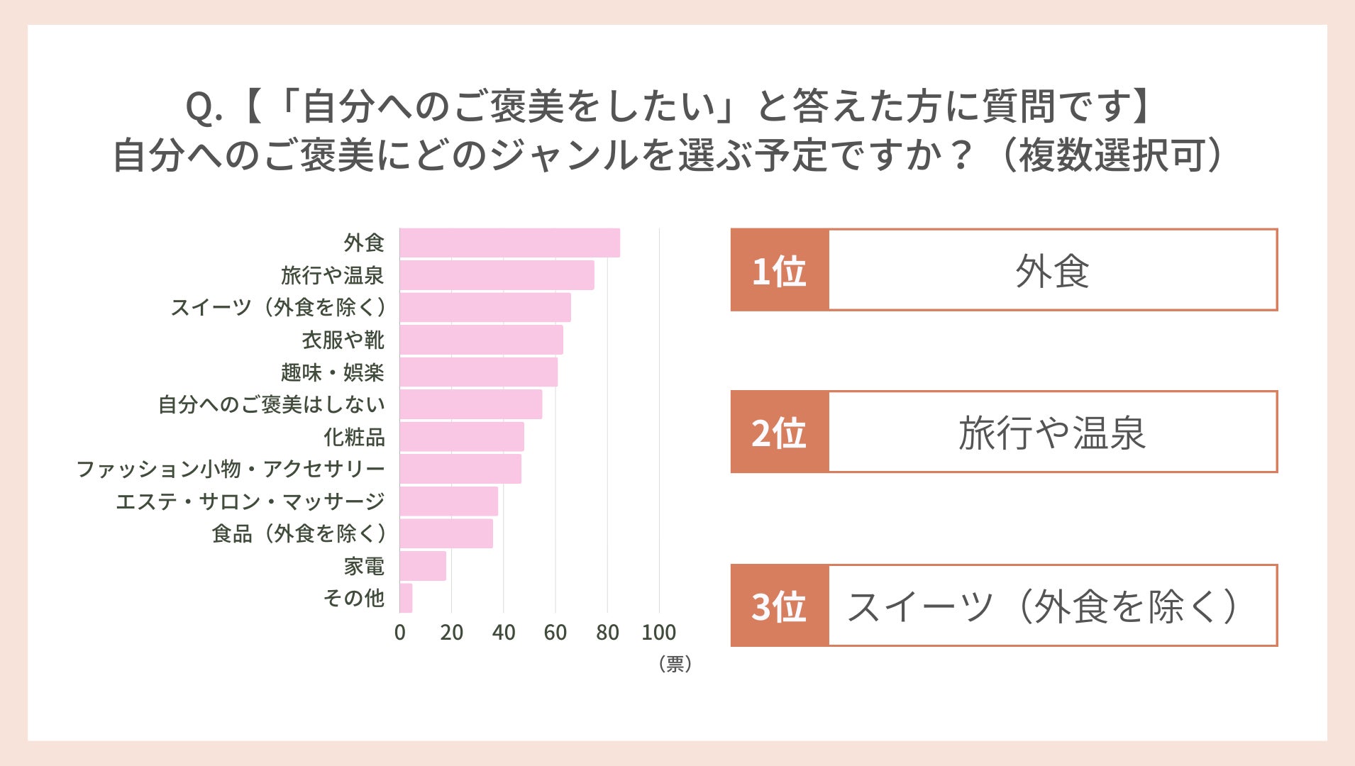 自分へのご褒美には「衣服や靴」61票「趣味・娯楽」55票も僅差で選ばれていました。