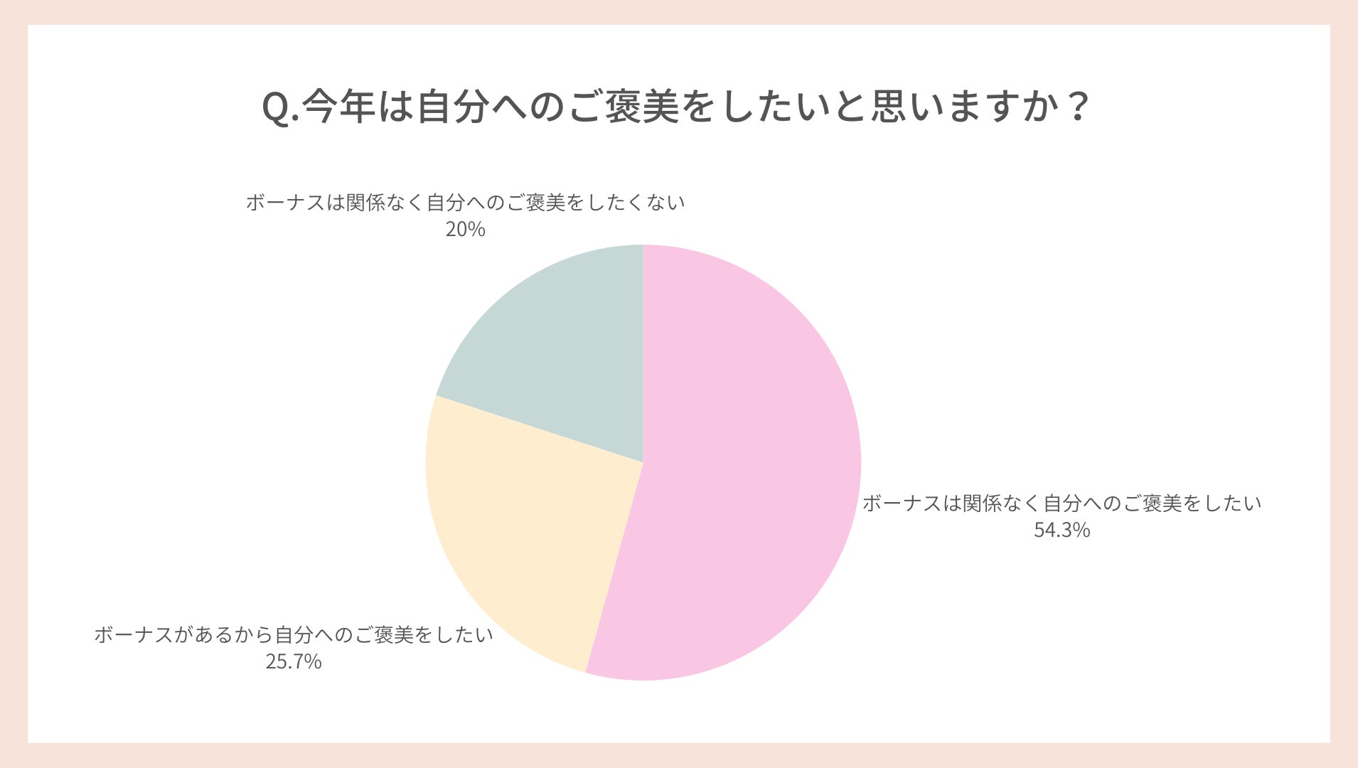 次に多かった回答は「【ボーナスがあるから】自分へのご褒美をしたい」25.7%。合計すると80%もの女性が、ボーナスの有無にかかわらず「自分へのご褒美をしたい」と考えていることがわかりました。