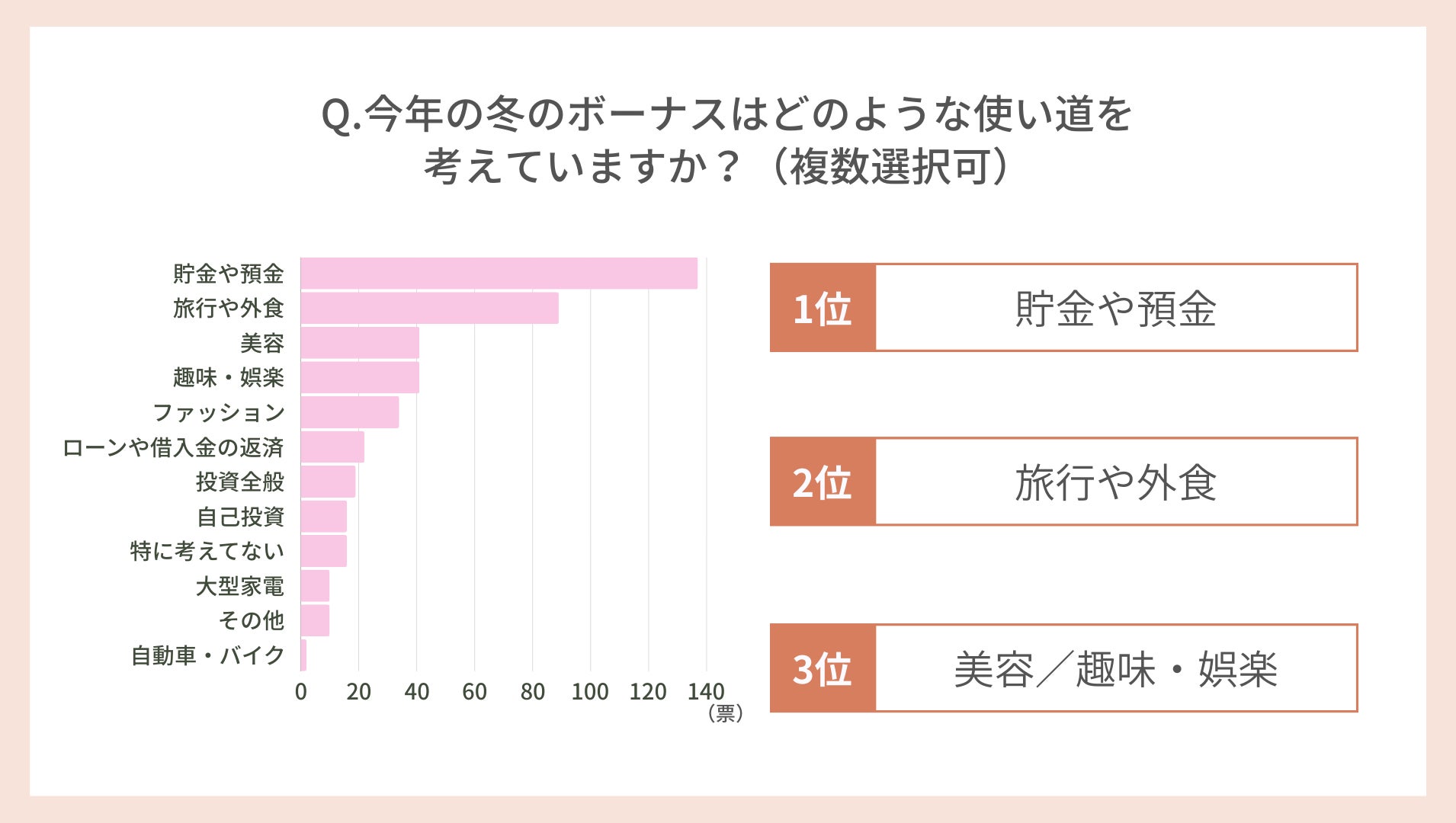 続いて「今年の冬のボーナスはどのような使い道を考えていますか?(複数回答可)」と尋ねたところ、もっとも多い回答は「貯金や預金」137票でした。