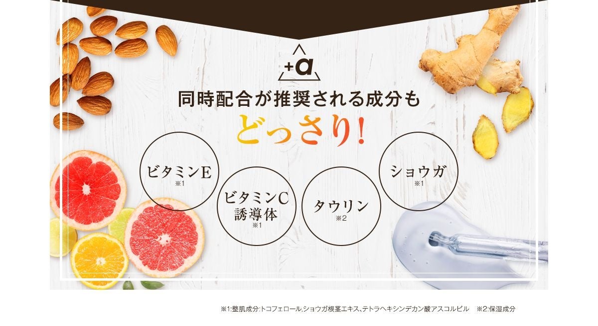 上記3成分のみならず、ビタミンE、ビタミンC誘導体、タウリン、ショウガといったその他の有効成分も配合しています。