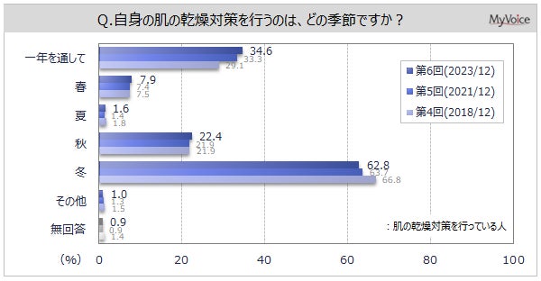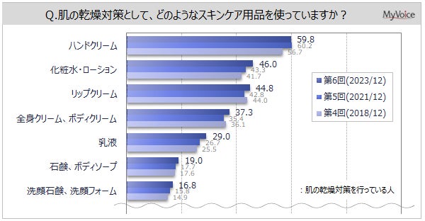 <今 回>(2023/12)https://myel.myvoice.jp/products/detail.php?product_id=30511 上記設問の他に「肌の乾燥を感じる部位」「乾燥ケア用品の選定理由」なども聞いています。 <第5回>(2021/12)https://myel.myvoice.jp/products/detail.php?product_id=28110 <第4回>(2018/12)https://myel.myvoice.jp/products/detail.php?product_id=24510 |