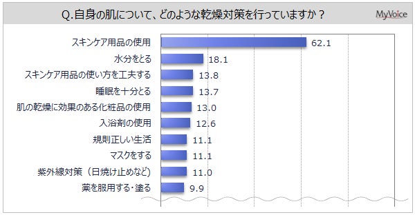 続いて、男性では「水分をとる」「睡眠を十分とる」「薬を服用する・塗る」「入浴剤の使用」が1割前後、女性では「スキンケア用品の使い方を工夫する」「水分をとる」「肌の乾燥に効果のある化粧品の使用」「紫外線対策」が各20%台となっています。