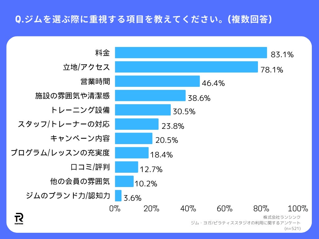 「Q.ジムを選ぶ際に重視する項目を教えてください。(複数回答)」(n=521)と質問したところ、「料金」がもっとも多く83.1%、「立地/アクセス」が78.1%、「営業時間」が46.4%と続きました。