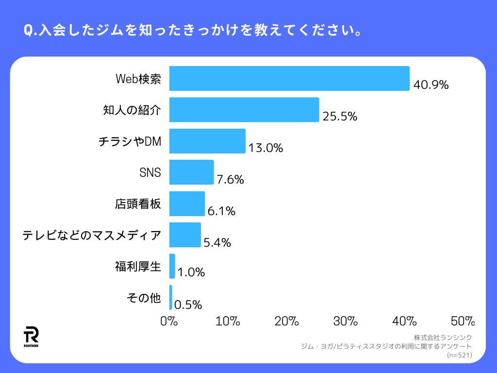 「Q.入会したジムを知ったきっかけを教えてください。」(n=521)と質問したところ、「Web検索」がもっとも多く40.9%、「知人の紹介」 が25.5%、「チラシやDM」が13.0%と続きました。