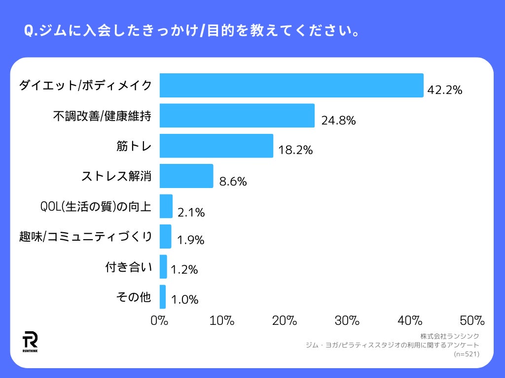 「Q.ジムに入会した目的を教えてください。」(n=521)と質問したところ、「ダイエット/ボディメイク」が42.2%、次いで「不調改善/健康維持」が24.8%、「筋トレ」が18.2%と続きました。