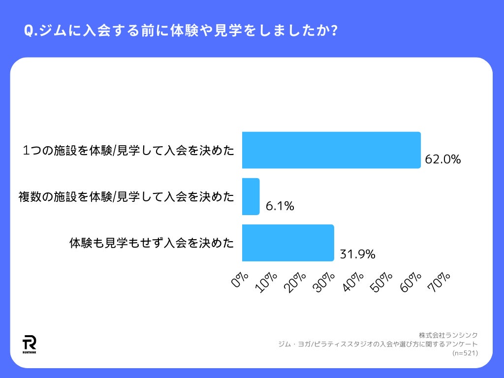 「Q.ジムに入会する前に体験や見学をしましたか?」(n=521)と質問したところ、「体験も入会もせず入会を決めた」が31.9%といった結果になりました。