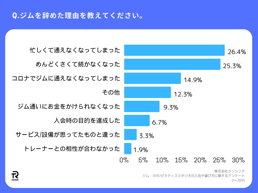 アンケート対象者の中からジムをすでに退会済みの人に「Q.辞めた理由を教えてください。」(n=269)と質問したところ、「忙しくて通えなくなってしまった」が26%、次いで「めんどくさくて続かなくなった」25%、「コロナでジムに通えなくなってしまった」15%となりました。