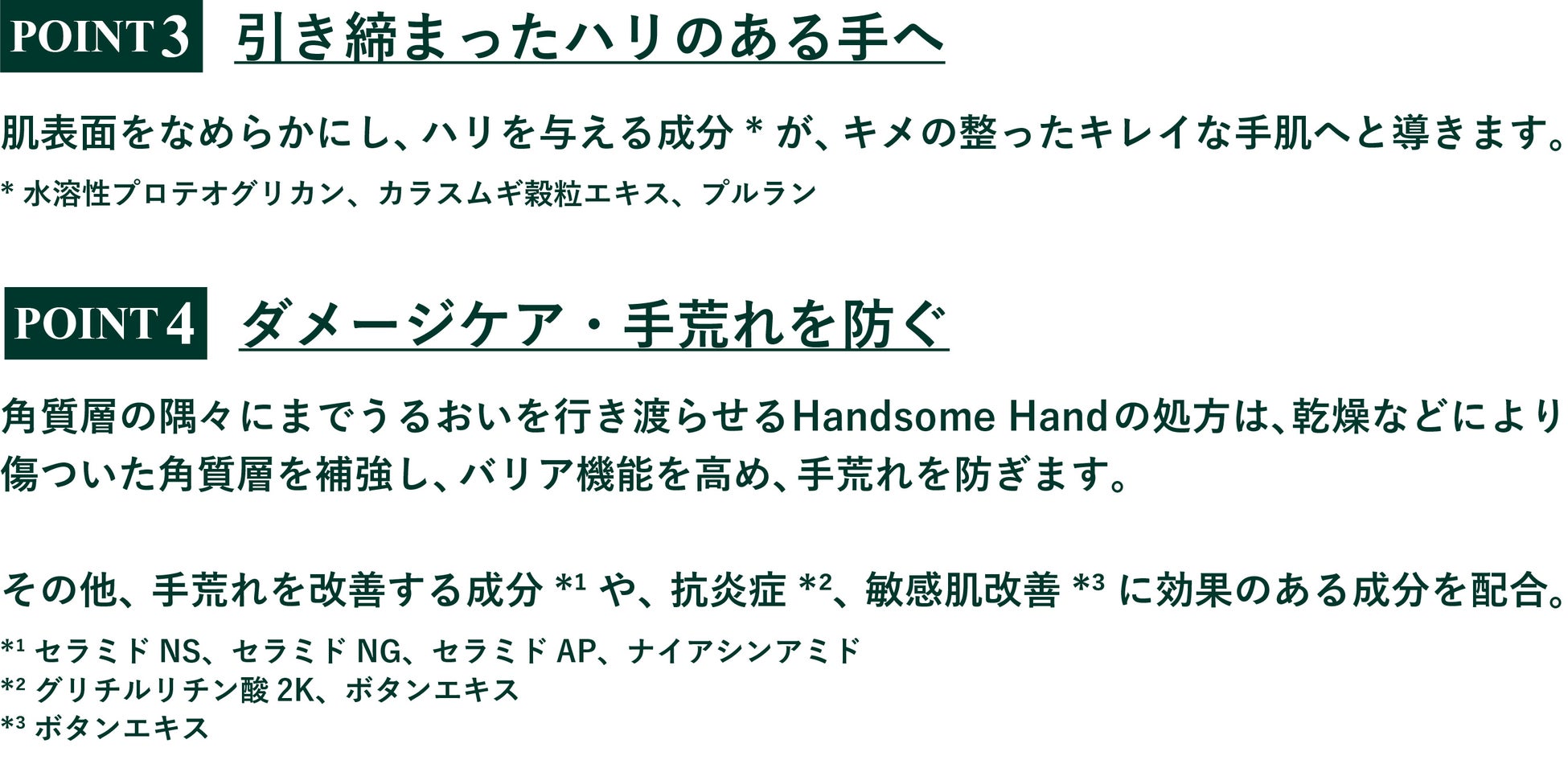 Handsome Handには、角質層の水分量を高めてハリを与える成分*¹や、血液やリンパの巡りに着目した成分*²を配合しています。毎日のハンドケアによって肌に明るさやなめらかさを与えると同時に、むくみケア*³をサポートすることで手元にスッキリとスマートな印象をもたらします。