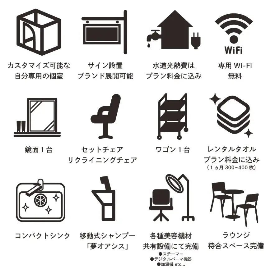 個人で占有できる完全個室空間を利用し、『独立したフリーランス美容師のブランド化(独自のサロンブランド)』をあらゆる形で支援し、施設の提供だけではなく、ライフスタイルや働き方の変化等、多様性の拡大を想定した「ニューノーマル時代の顧客体験」をご提供中です。