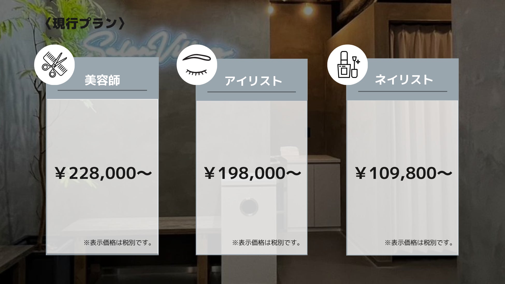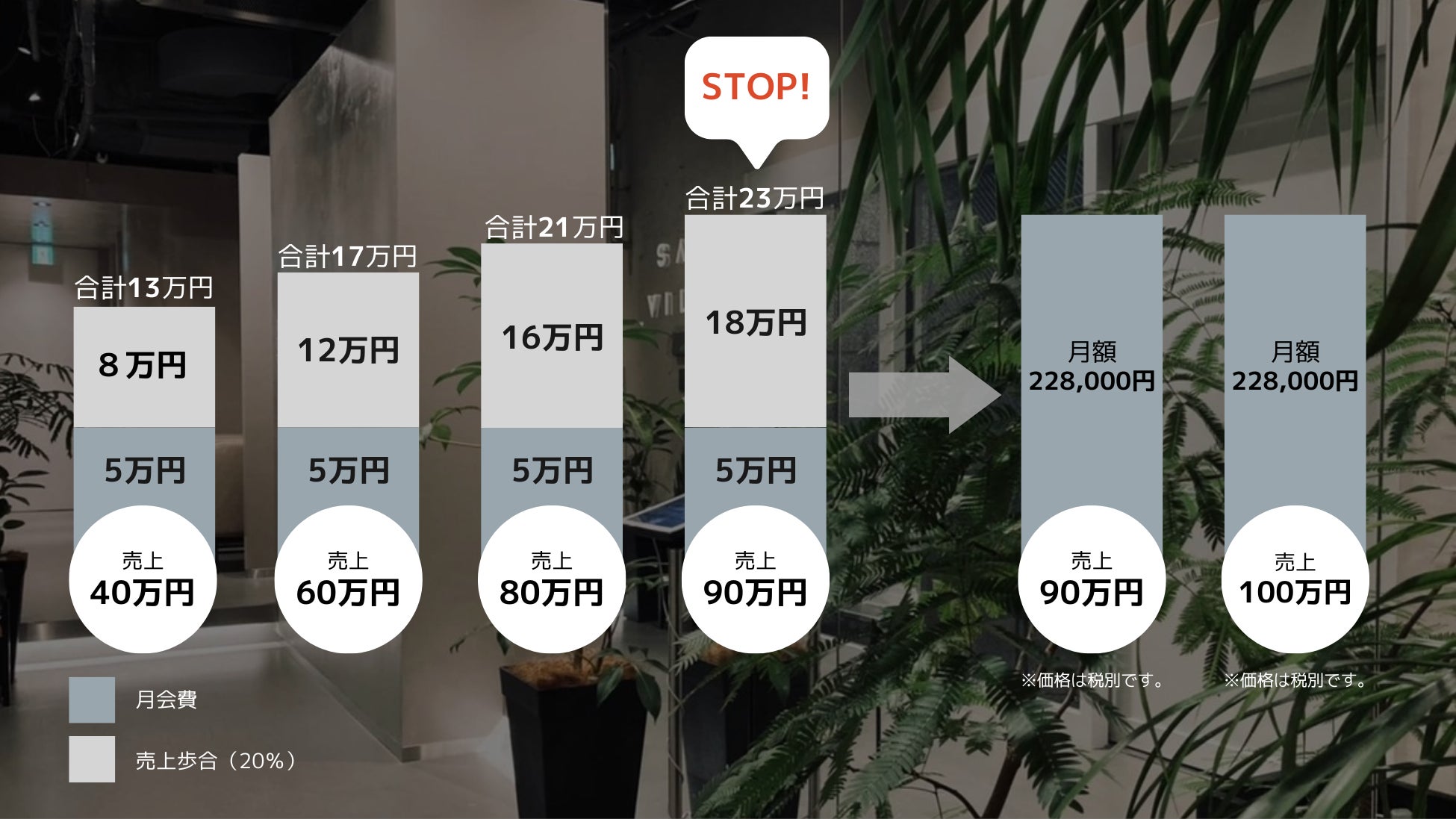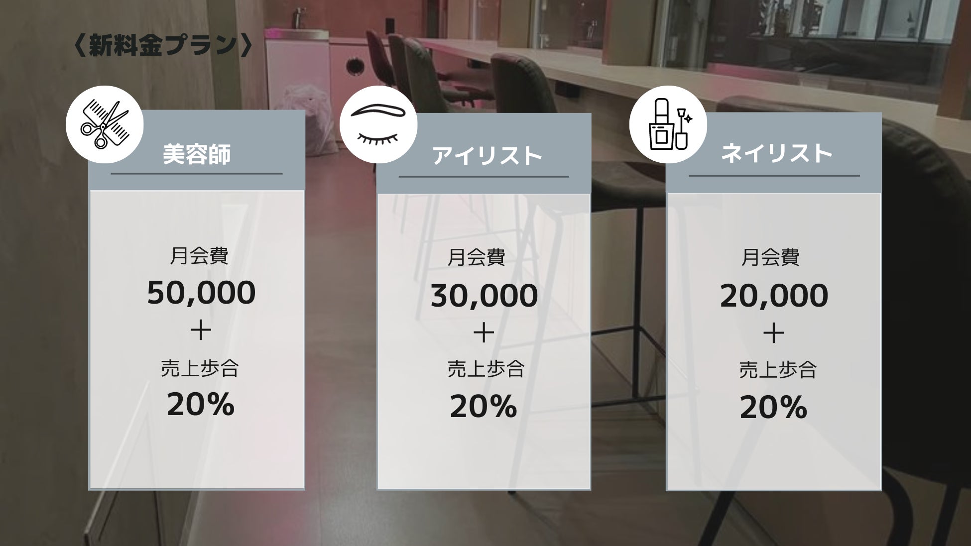 新料金プランでは、固定費+売上に応じて20%の歩合が必要になるだけで、各種備品の使用量や初期費用は0円。「独自のブランド化」を実現できる一室ずつしっかりと区切られた完全個室でありながら、大きなリスクを伴わずに独立開業しやすいプランになっております。