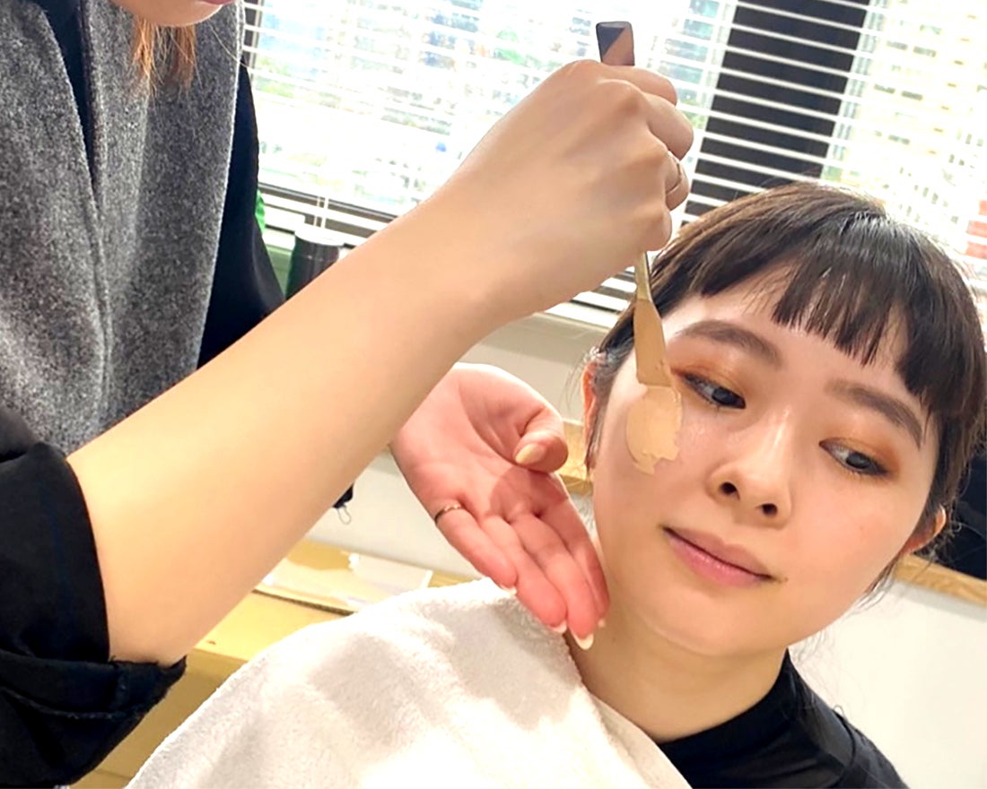 頬の一部にレプリカ剤をのせ、乾かしたのちに剥がし、肌のキメのレプリカを取ります。
