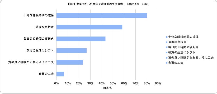また、効果的だった大学受験直前の生活習慣について質問したところ、「十分な睡眠時間の確保」という回答が1番多く、実際に多くの東大生が、受験直前の生活においても「睡眠」を重要視し、確保していたことが明らかになりました[図7]。