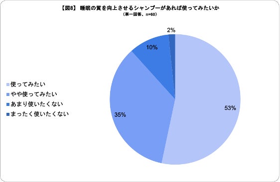 今回の調査の中でも、「睡眠の質を向上させるシャンプーがあれば使ってみたいか」と質問したところ、約90%の東大生が「使ってみたい(やや含む)」と回答しており[図8]、手軽に睡眠環境をサポートしてくれる商品の需要は高いと考えられます。