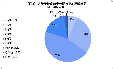 中には、「試験前日に眠れず、寝不足で大学入試を受けて落ちた」という回答もあり、普段から睡眠時間を確保し、試験前日もしっかりと睡眠をとる事が大切であると考えられます。