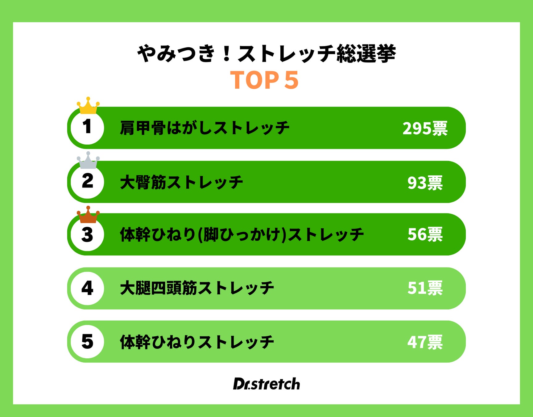 ストレッチ専門店Dr.stretchで提供しているパートナーストレッチのうち20の中から、お客様が最もスッキリしたと感じたストレッチに投票いただき選出する「やみつき!ストレッチ総選挙」。初開催の今回1位に輝いたメニューは「肩甲骨はがしストレッチ」で約35%の票を獲得しました。2位は「大臀筋ストレッチ」、3位には「体幹ひねり(脚ひっかけ)ストレッチ」がランクイン。特にデスクワークの際に固まりがちな上半身や臀部のストレッチに人気が集まりました。寒さにより体が強張りがちな冬の季節。これらのストレッチは体の深層部から伸ばすことで芯から温めるだけでなく、冬ならではの体のお悩み解決もサポートします。